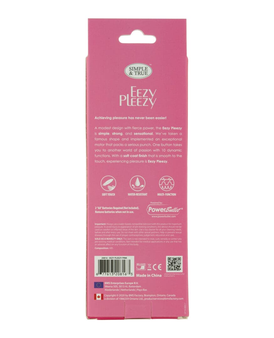 Experiencing pleasure has never been easier! BMS Factory’s Eezy Pleezy brings classic and brand new together to make the only bullet vibrator you’ll ever need! The Eezy Pleezy features the classic, famous shape of a bullet vibrator that we’ve all come to know and love. However, the secret lies within. Hiding inside that famous shape is an advanced PowerBullet® motor containing vibrations that go from mild to wild! The mild vibrations are calm, yet deep and rumbly for beginners, while the wild vibrations are fierce and powerful for more seasoned Sexperts. Whatever strength you’re looking for, the Eezy Pleezy has something in store for everyone! Choose between 10 speeds for the one that’s perfect for you – you’re in total control! One button does all the work, so sit back, relax, and enjoy all the pleasure-filled vibrations this bullet has to offer! Forget about cords and chargers, the Eezy Pleezy is conveniently battery operated for quick and easy fun on the go. Enjoy the soft-coat finish that glides across the skin with ease and feels super soft to the touch. Made of a body-safe silicone material that is safe to use on all your most delicate areas. Material: Silicone, ABS Requires 2 AA batteries, not included. Dimensions: Overall Length – 7 inch Width – 1 inch Key Features: Bullet vibrator PowerBullet motor 10 functions One easy-press button Soft coat finish
