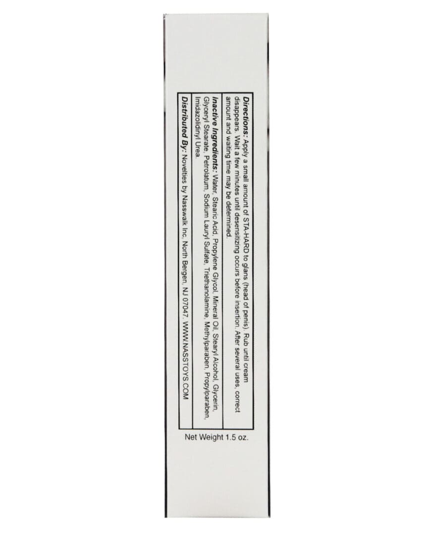 Designed to elevate your pleasure and prolong your passion, Nasstoys Sta-Hard Unflavored Delay Cream offers a remarkable solution for those seeking to extend their intimate experiences. Unleash a newfound level of control and confidence as you indulge in intimate encounters with your partner. The advanced formula features benzocaine, a potent yet gentle desensitizing agent, carefully measured to provide the perfect balance of effectiveness and comfort. Benzocaine helps to temporarily reduce sensitivity, allowing you to extend your arousal and delay climax, while still experiencing the full spectrum of pleasure. Not only does our Sta-Hard Delay Cream deliver exceptional results, but it does so without any distracting flavors. This unflavored option ensures a natural and seamless experience, so you can focus entirely on the intimate connection between you and your partner. Applying Nasstoys Sta-Hard Unflavored Delay Cream is quick and easy. Simply dispense a small amount of the cream onto your fingertips and gently massage it into the desired areas before intimacy. Allow a brief moment for the cream to be fully absorbed, and then let the passion unfold. The discreet and travel-friendly packaging makes it a convenient addition to your bedside drawer or toiletry bag, ensuring you’re always prepared for heightened pleasure whenever the mood strikes.